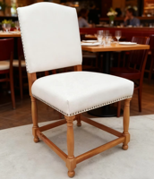 Modern antika perçin beyaz keten döşemeli katı ahşap yemek sandalyesi