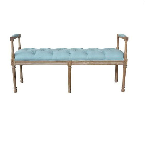 Antika ahşap oyma püsküllü düğme yatak sonu dışkı gökyüzü mavi kumaş uzun dikdörtgen yemek sandalyesi