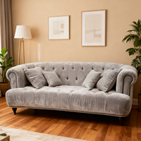 โซฟาสามที่นั่งกำมะหยี่สีเทาอ่อนแต่งด้วยผ้ากำมะหยี่แต่งขอบเล็บ